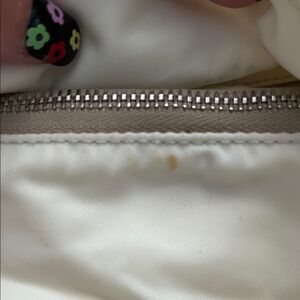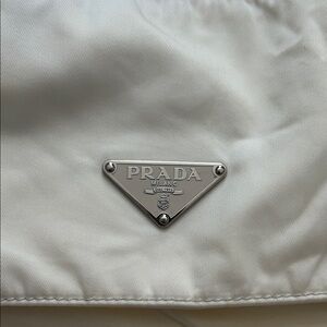 Elegant cream shoulder bag by Prada. Features iconic silver logo plaque.