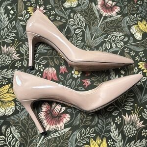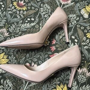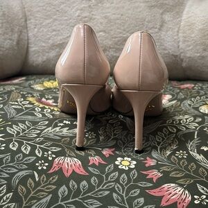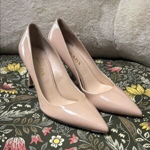 Step into elegance with these Prada heels, crafted in a luxurious cream patent leather. Featuring a classic pointed-toe design and a sleek stiletto heel, these shoes offer a timeless and sophisticated look. Perfect for both professional and formal occasions, they are a versatile addition to any wardrobe.