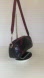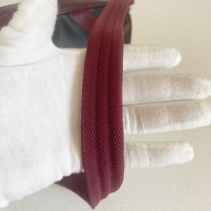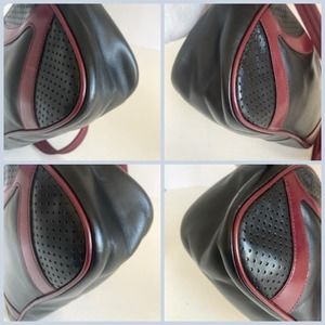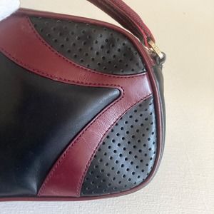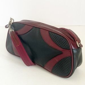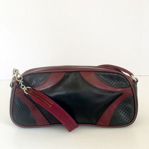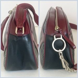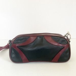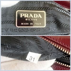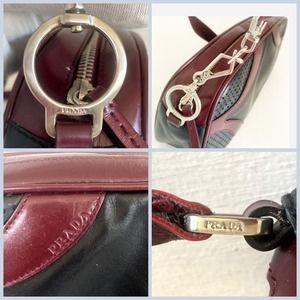 Elegant Prada crossbody bag. Features burgundy and dark green leather. Stylish and versatile design.
