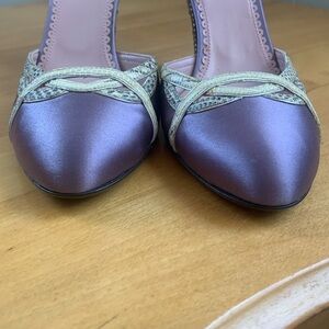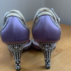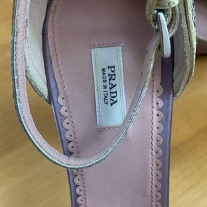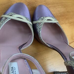 These Prada heels are beautiful. Condition is excellent used. They show little signs of wear. The leather ankle straps show some age on the edges (pic 5). No missing crystals. Satin is excellent. Gorgeous. The trim has hints of a lizard print.