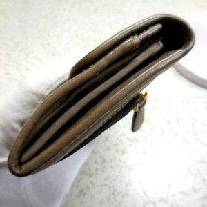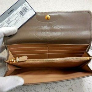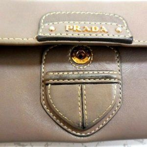 PRADA, dark taupe or 'argilla' colored leather, envelope, bi-fold style, extra large, 'City Calf' line continental wallet with six long compartments, a back zip pocket, lots of card slots, a snap closure, and a push button release! All measurements are approximate. This item is vintage/pre-owned. It may show minor signs of wear at the folds, scratches/ tarnish to the hardware, and shallow scratches to the super soft leather. 8"L x 2"W x 4"H. Item #: 25903163.