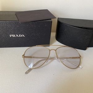Sunglasses with a pilot silhouette. The exclusive Prada Chromic photochromic lenses add a modern touch and adapt to any change in sunlight, darkening in a few seconds. Prada lettering logo.
