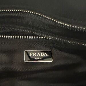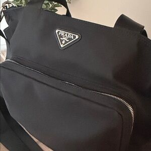 Elegant Prada diaper bag in black. Features a sleek design with a front pocket. Ideal for daily use. 100% Authentic. Excellent condition. Serious inquiries only please.