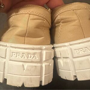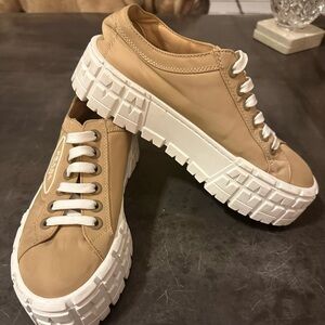 Worn only 1 time - Prada tan nylon sneakers, with white lug sole.