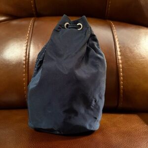 Sophisticated Prada drawstring bag in midnight blue. Ideal for travel and daily use. Combines elegance with practicality.