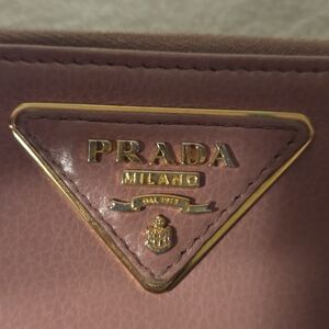Chic Prada wallet in dusty rose leather. Features gold logo detail.