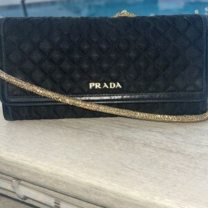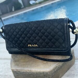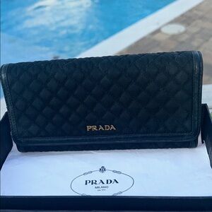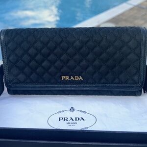 Prada EUC Black Tessuto Quilted Nylon Long Wallet, features the Prada logo in gold-tone hardware. This Pre Loved wallet is a long flap wallet with two snap closure and a spacious interior. This Pre Loved Prada wallet comes with Authentic box and tissue paper. If You BUY IT DIRECTLY from my closet at Closet Price You will Receive Black SPARKLING UNBRANDED Crossbody chain with gold hardware. π₯