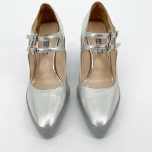 Prada F/W 2015 Silver Metallic Leather Mary Jane Rubber Trim Block Heels IT 37.5