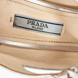 Keywords: Prada Fall 2015, Mary Jane heels, runway shoes, statement heel, retro-futuristic, fashion-forward, designer pumps, collectible Prada, block heel, silver leather