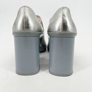 Prada Fall 2015 Silver Metallic Leather Mary Jane Rubber Trim Block Heels