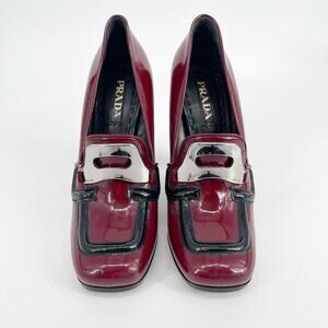 Prada Fall 2010 Burgundy Patent Leather Loafer Square Toe Block Heels IT 39.5