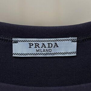 This sleek black tank top by Prada features a fitted design with a classic scoop neckline. Made from a smooth, solid fabric, it offers a timeless and versatile style perfect for any occasion.