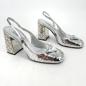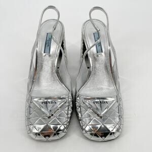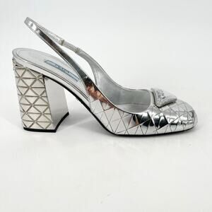 Prada Geometric Silver Metallic Logo Triangle Slingback Pumps In Argento IT 38