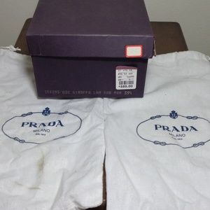 The package includes the shoes, the original Prada box with the $585.00 price tag, and the two dust bags, which do have a couple of stains on them as shown.