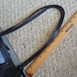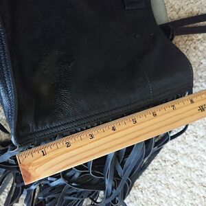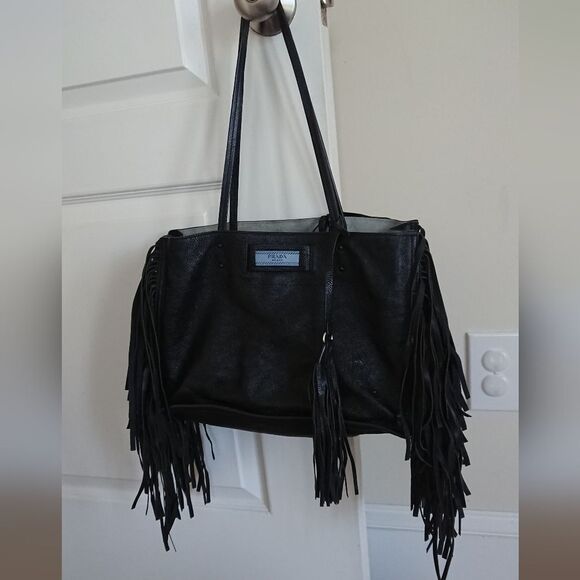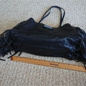 Elevate your style with this Prada black leather tote bag. Featuring chic fringe details, it's perfect for any occasion. The luxurious design and spacious interior make it a must-have accessory.