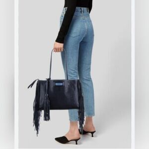 This tote bag features a fringe leather body, flat leather straps, an exterior zip pocket, an open top, and interior pockets.