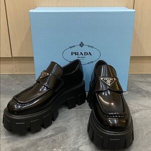 Chic Prada loafers with a glossy finish. Features a bold platform sole.