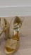 New and never worn! Elegant platform sandals with gold embellishments. Features an ankle strap. Perfect for a glamorous, stately look! An iconic shoe for bachelorettes, holidays and any occasion!