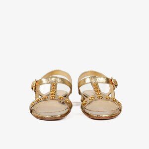 Step in style with these Prada flat sandals. Made with a luxurious gold metallic material and adorned with tonal studs, these sandals are the perfect blend of fashion and comfort. Elevate your look with these sophisticated sandals and make a statement wherever you go.