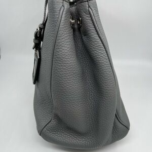 Elegant Prada tote in gray leather. Features dual handles and a luggage tag. Silver hardware accents.