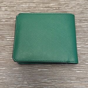 Prada’s Bi-fold wallet is an exceptional accessory to manage your bills and cards reliably! Crafted in green Saffiano leather, it features the brand letters embossed on the front bottom. This wallet houses six card slots, open compartments and slip in pockets to manage your essentials in an organized state!