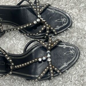 Prada Grey Metallic Studded Leather T Strap Sandals Size 39.5 Pre-owned. Minor signs of wear, scuffs. See pictures