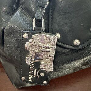 Beautiful soft leather top handle, adjustable strap, keys, lock and Prada charm. Hardware is silver. This is a stand out bag! Approximately 13.5in x 9in x 6in.