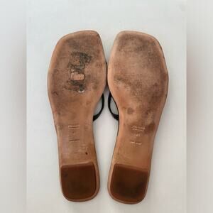 Prada Heeled Sandals Gold Logo Black Leather T Strap Flip Flop Slides EU 41