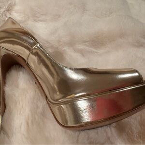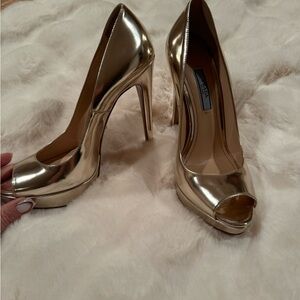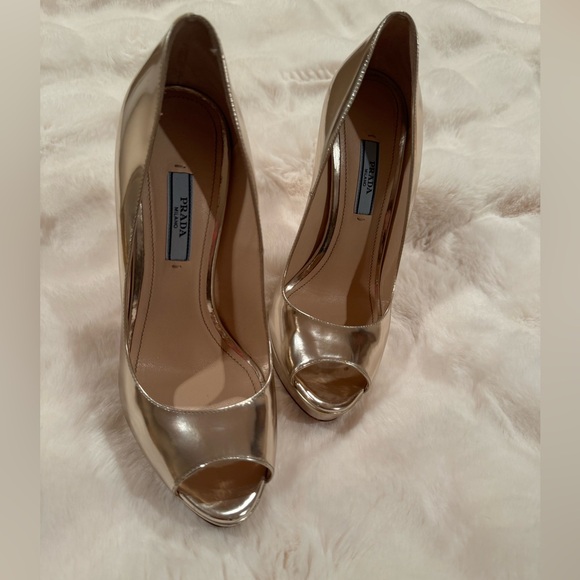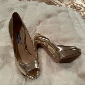 Prada Gold Peep-Toe Platform Heels.