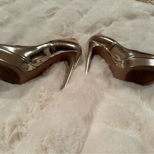 These stunning Prada heels, crafted in a metallic gold finish, feature a chic peep-toe design and a high platform for extra height and elegance. Perfect for special occasions or adding glamour to any outfit.