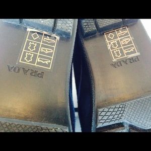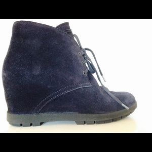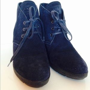 This is the Prada Desert Ankle Boot from Barneys New York. It has a hidden wedge and rubber soles making it very walkable and stylish. It is in a navy sueded leather for an "it-girl" look. The shoes are in great shape and come with the original dust bag, box, sticker price and even the receipt!