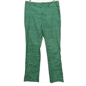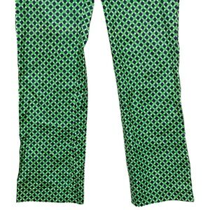 Features: 100% cotton fabric in green geometric pattern. High waist. Straight leg. Pockets. Zip fly.