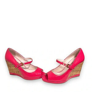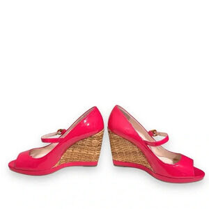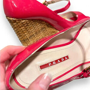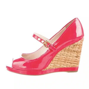 Prada Hot Pink Patent Leather Peep Toe Woven Wedge Heeled Mary Jane Sandals 8