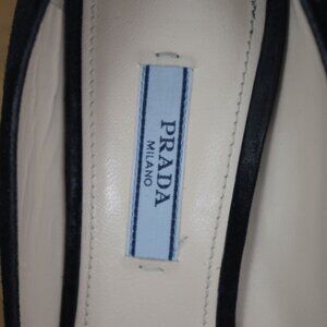 This listing is for a classic pair of Prada Italian Made heels. They are in black suede with a pointed toe, approximately 3 5/8" from side heel and full leather construction.