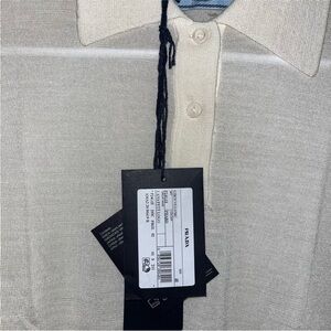 Sophisticated ivory polo by Prada. Features button-up front and classic collar.