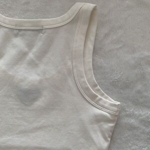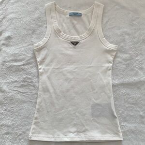 Elegant ivory tank top by Prada. Features iconic logo accent. Ideal for versatile styling.