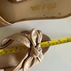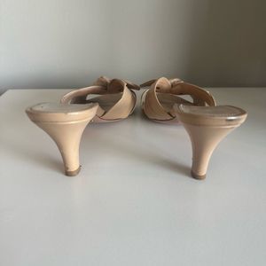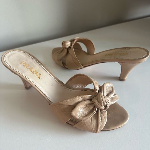 Prada leather nude mules with kitten heels and bows, so stylish, these are worn, still in good condition, please pay attention to pictures for wear, these are a European size 36, I put a women’s size 6 in listing, but please make sure when purchasing to look at the measurement photo, Thank you.