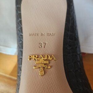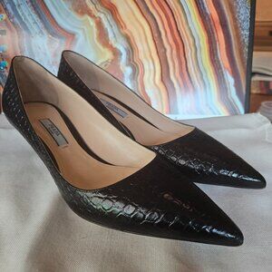 Faux Croc texture leather pumps. The size is 6.5 to 7. Heels are 2"s. No scuffs, marks of any kind. Excellent condition pratically new. Dark brown. Comes in original box, 2 shoe bags and heel protector replacements.
