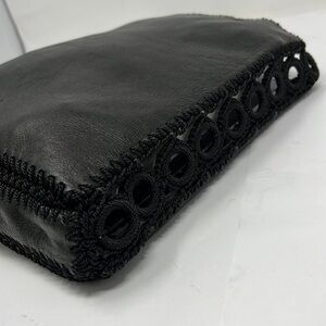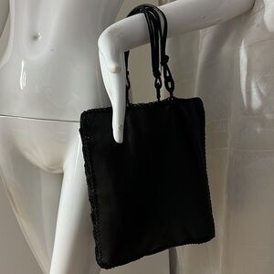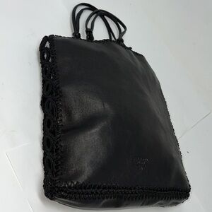 This is a beautiful rare Prada Leather And Crochet Small Tote Bag. In pristine condition. Super soft leather with logo embossed at the bottom and beautiful crochet accent keeps the flat bag together.