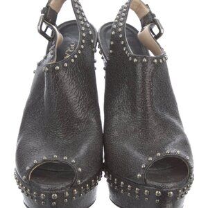 Prada Grey Leather Slingback Platform Pumps with Peep Toe & Studded Accents