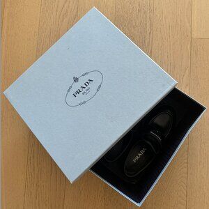 Timeless black leather loafers featuring Prada’s iconic triangle logo. Dress them up or down – luxury meets everyday wear.