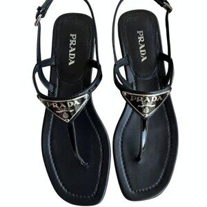 Prada Leather logo Sandals 39.5 $900 Lg triangle emblem with Box
