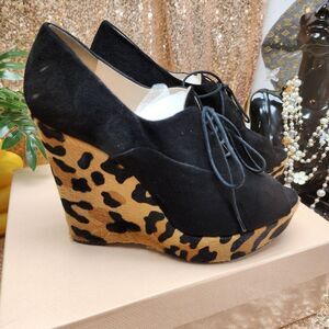 New In Box, authentic Prada Leopard Print Pony hair and suede wedge heel. Heel has a peep toe and a lace up front. Platform toe and wedge heel.