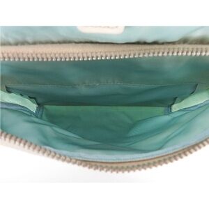 Chic Prada backpack in light blue. Features cream straps and buckle. Stylish and functional design.