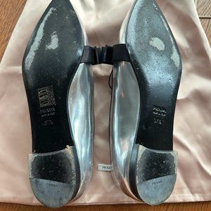 Prada silver loafers with pointy toe and black bow