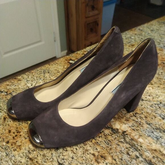Prada Logo Brown Suede Leather Silver Cap Round Toe Chunky Heel Pumps Sz 7.5 38.