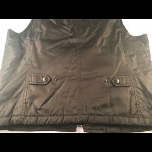 Effortlessly cool and so versatile, this Prada vest is a must have staple in your wardrobe. Lots of working pockets. Snaps on the back can be adjusted to give an even more fitted silhouette. Nylon is in excellent condition. Collar and zipper is a deep brown. Please let me know if you have any questions before purchase. In any weather this vest is the smart and stylish choice.