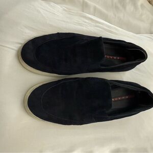 Elegant navy blue suede slip-ons by Prada size 12. Perfect for versatile style and comfort. Great condition.