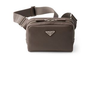 Sleek Prada belt bag in taupe leather. Features adjustable strap and secure zip closure. Ideal for hands-free convenience.