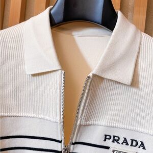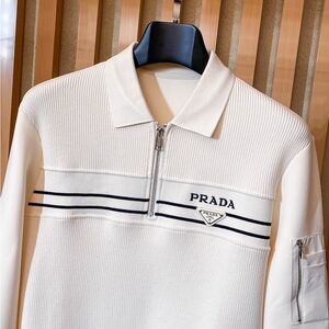 Elegant crewneck sweater by Prada. Features a half-zip design and logo detail.